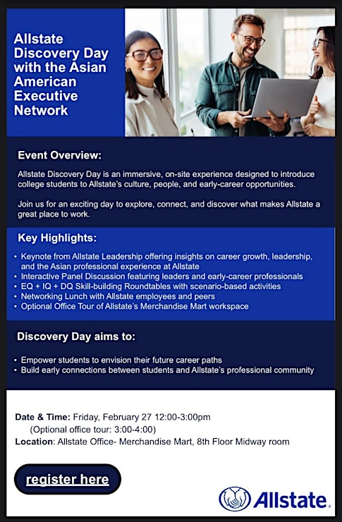 Join us in person for an exciting opportunity to kickstart your career with Allstate. Connect with industry pros, discover amazing career paths, and get the inside scoop on what makes Allstate a great place to work. Don’t miss out on this chance to launch your future with AAEN Career Launch @ Allstate Discovery Day – your next big step awaits!