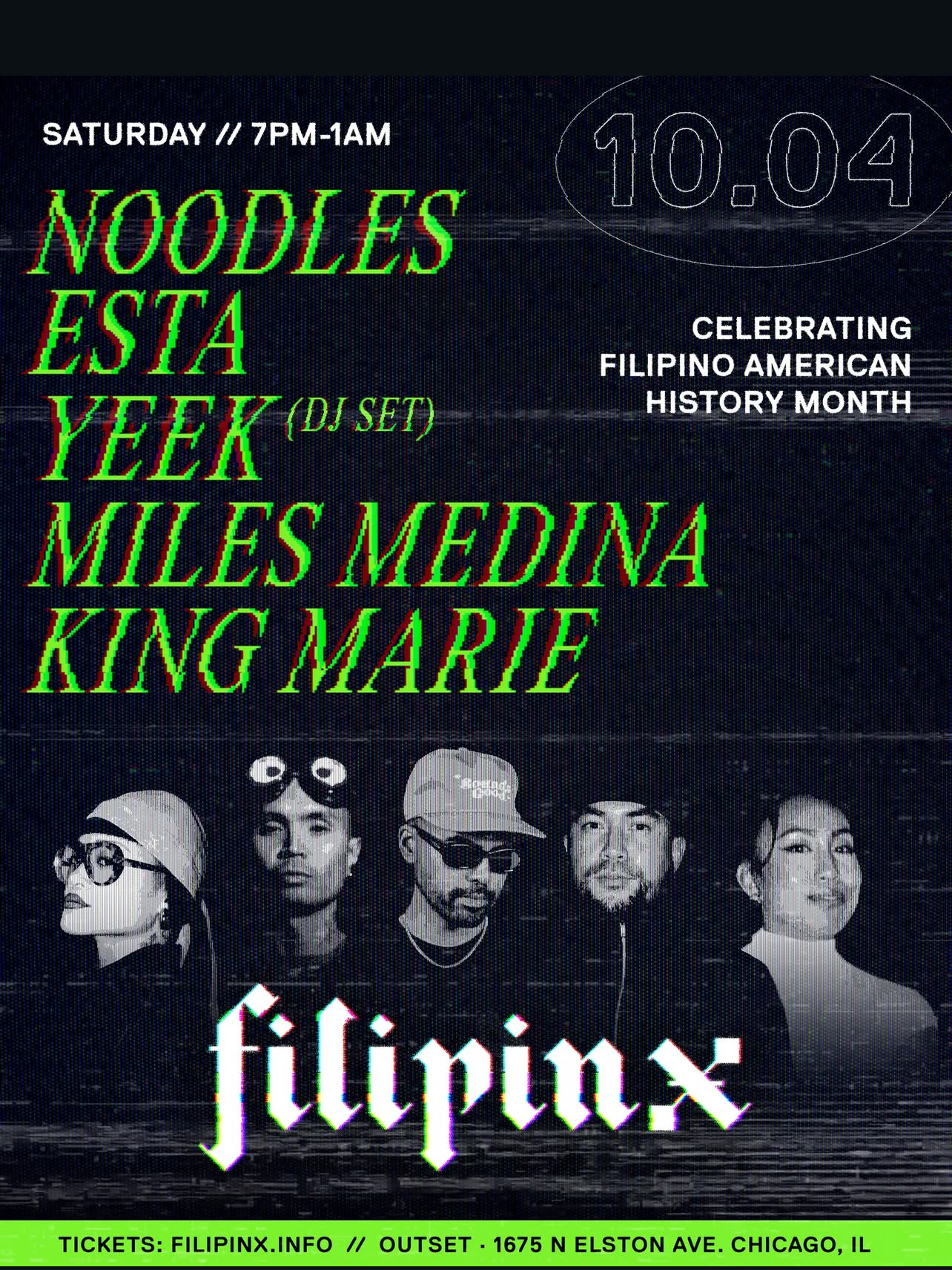 On Saturday, October 4, we’re taking over Outset Chicago to celebrate Filipino American History Month with an all-star lineup of Noodles, Esta, Yeek (DJ set), Miles Medina, and King Marie. Expect a night of community, culture, and celebration with sounds that bridge generations and bring people together.
