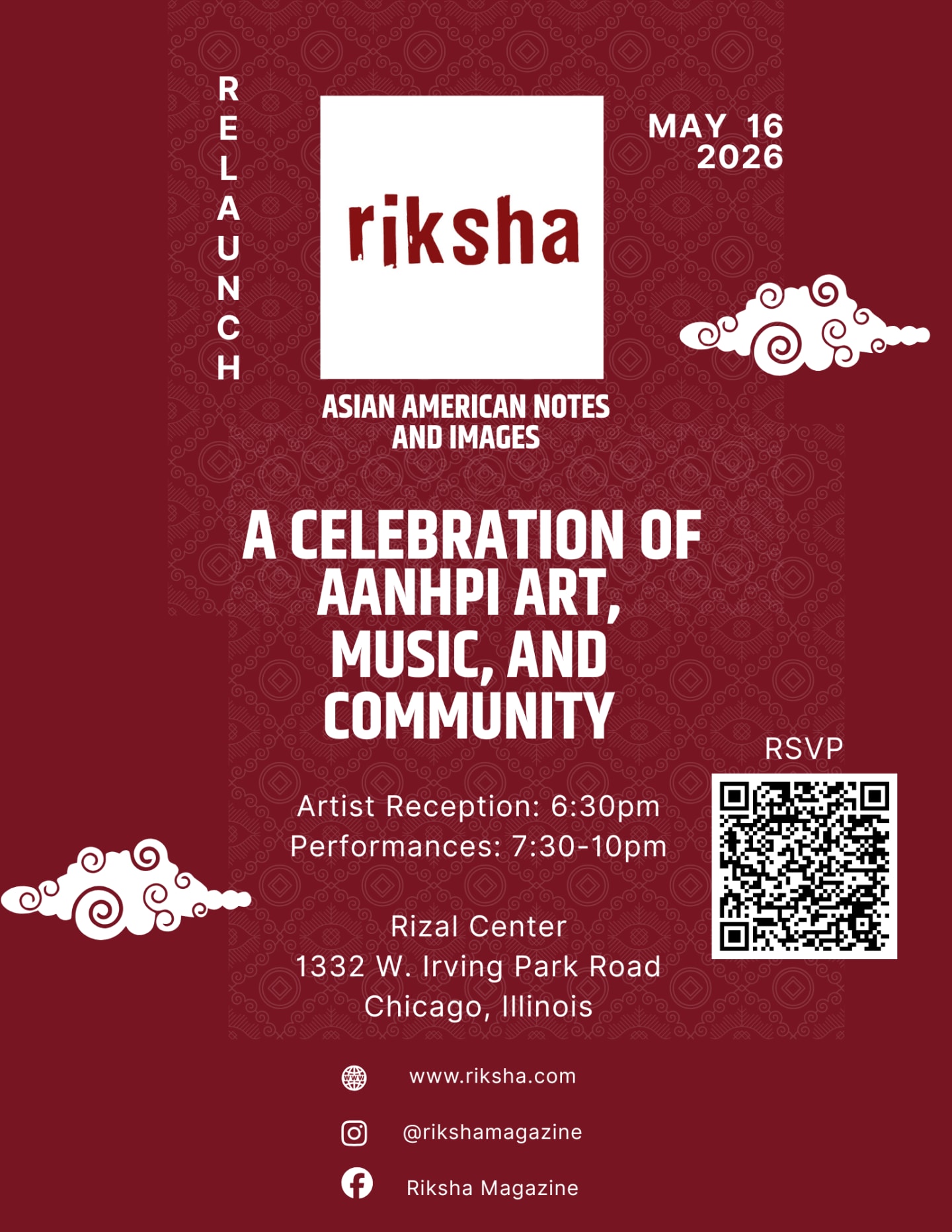 Please join us for Riksha Returns, a multidisciplinary evening of Asian American, Native Hawaiian & Pacific Islander art, music and community storytelling on Saturday, May 16, 2026, at the Rizal Center in Chicago. First launched in 1993, Riksha began as a literary and cultural platform, including a print magazine and live performances, amplifying Asian American voices in Chicago. In 2017, Riksha evolved into an online magazine continuing its mission to showcase AANHPC voices. After a period of quiet in recent years, Riksha returns—reimagined as a live gathering and evolving archive. Saturday, May 16, 2026 6:30pm: Artist Reception 7:30pm: Performances include CIRCA Pintig, Stir Friday Night, a film by Nothing Without a Company and Banyan Asian American Writers Collective. Music by Sona Umbra and Chika Sekiguchi. Poets and writers include Patty Cooper, Hannah Ii-Epstein, Vinh Hoang, Sharmili Majmudar, Lani Montreal and Dwight Okita. Admission is free. Registration is encouraged and donations are accepted. Light bites will be served (dairy/nut/shellfish-free). Art Exhibit runs from May 4 to June 5, 2026. By appointment or as Rizal Center public events allow.