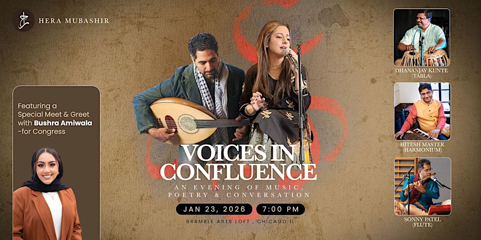 Join Hera Mubashir and Ronnie Malley for a captivating evening of music, poetry, and conversation. Voices in Confluence brings together South Asian and Middle Eastern musical traditions, carried by artists for whom Chicago is home and who continue to shape its cultural landscape. The evening is a live conversation between lineages - raag and oud, voice and rhythm - coming together in a shared musical exchange.